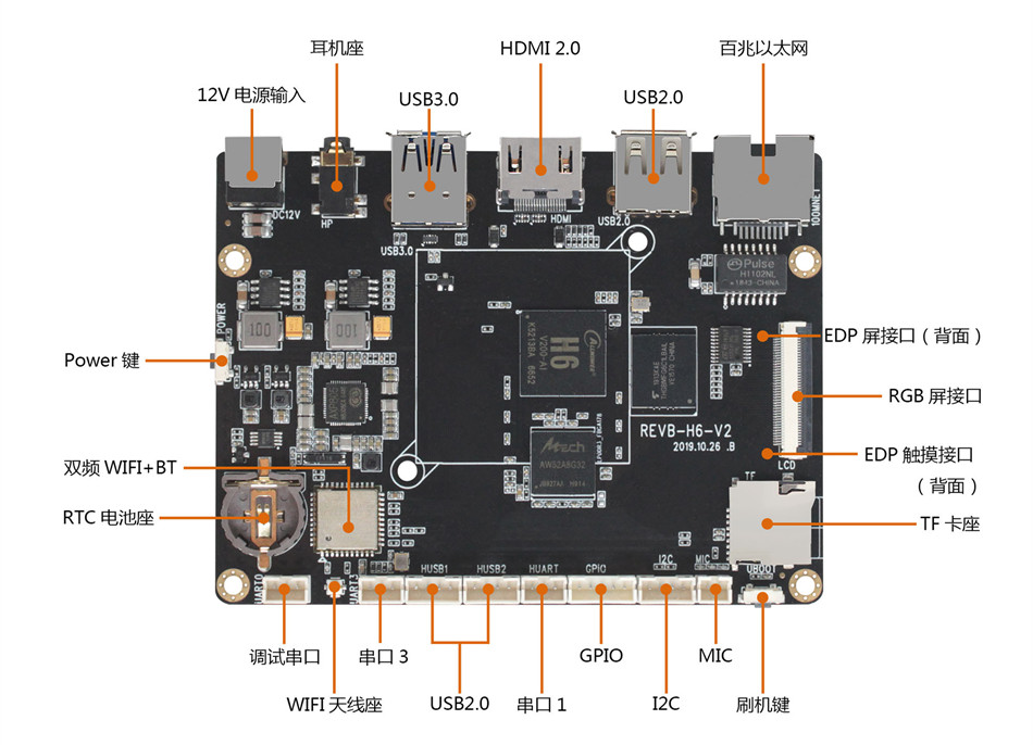 REVB-H6-V2搭載了珠海全志的H6芯片,ARM Cortex-A53架構(gòu)64位CPU,1.8GHz主頻,集成Mali-T720低功耗GPU,主頻700M,適合運行圖像識別算法。具有超強的視頻解碼能力,兼容所有主流的視頻格式,能夠支持H.265格式4K / 60幀10bit視頻,支持4K/800萬像素USB攝像頭硬件MJPEG解碼。